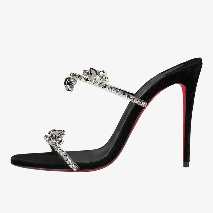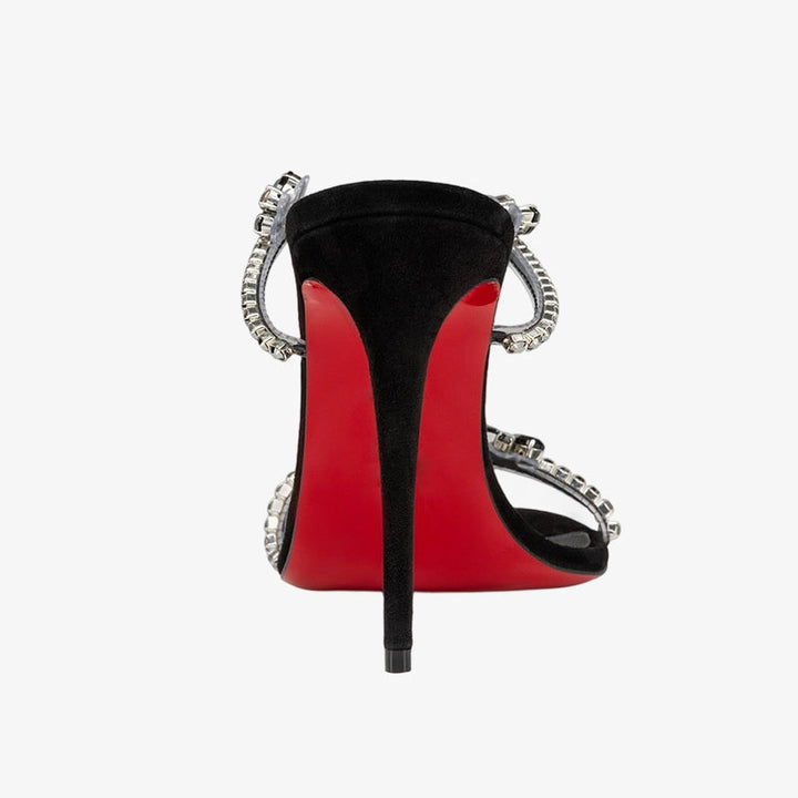These elegant high heels feature a supportive fitted heel and two slim PVC straps adorned with black rhinestones, set on a striking red sole for a refined finish. Crafted in suede and PVC.