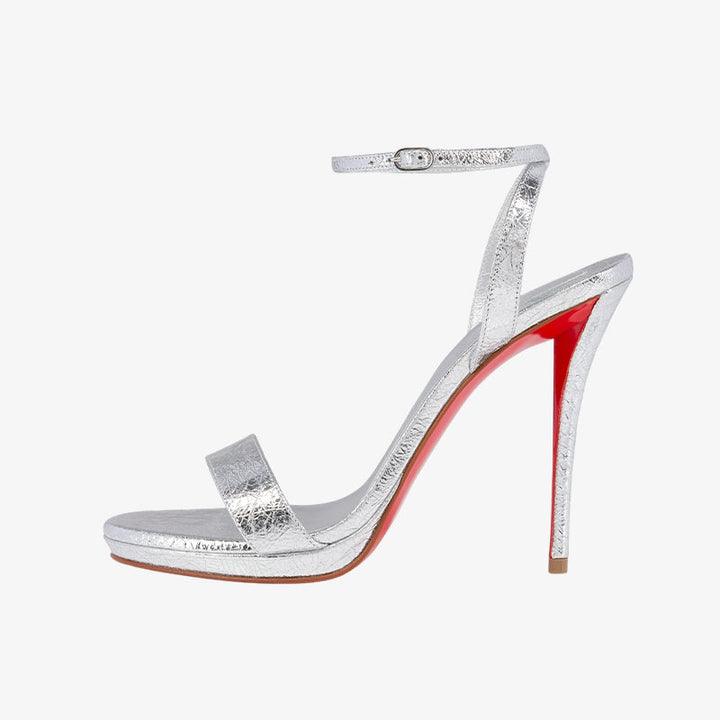 This sandal features an elegant silhouette with a stiletto heel, open toe, and slim heel strap. Crafted from silver calf leather, it includes a insole and a durable, vibrant red sole for a striking finish.