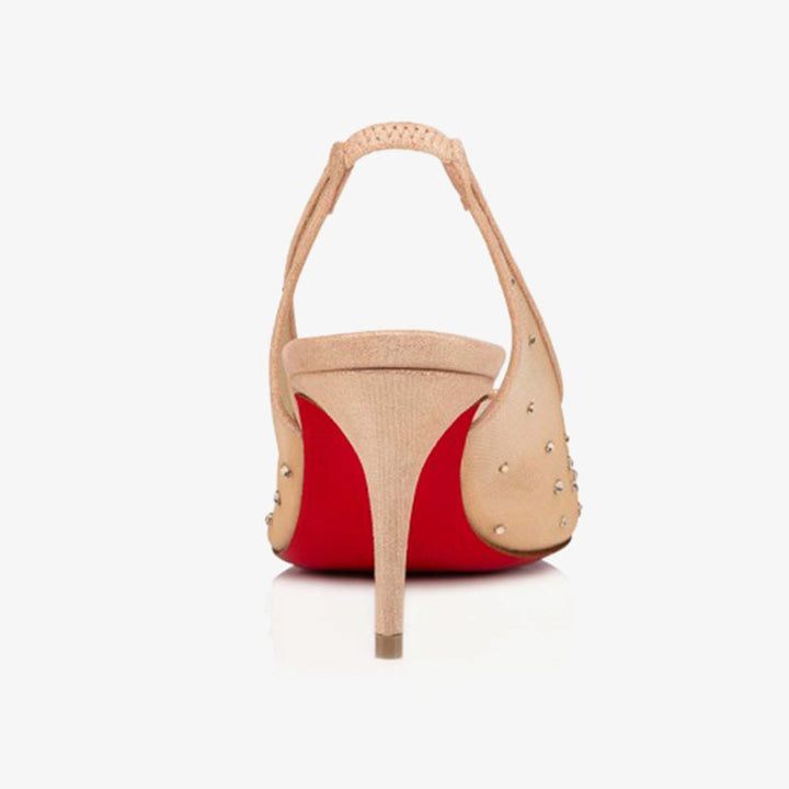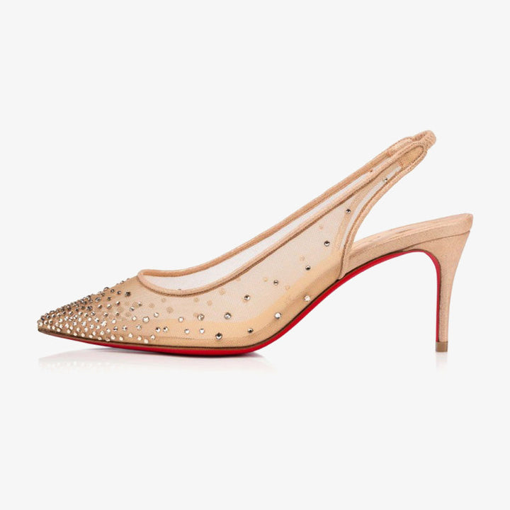 This elegant model adorns its light silk mesh upper with a stunning gradient of handcrafted iridescent rhinestones. Delicate laminated suede trims add a magical finish, while the iconic plunging neckline reveals the foot with finesse. Set on an 80 mm heel, this shimmering design blends sophistication and enchantment.