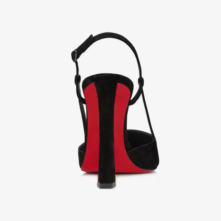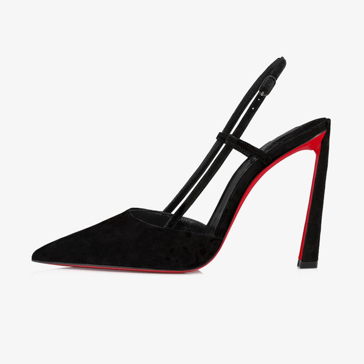 The pump has a pointed toe reminiscent of a bird’s beak, offering a bold, sophisticated silhouette. Crafted from luxurious black velvet, it showcases exceptional savoir-faire. Set on a 100 mm bevelled heel, an elegant, sleek strap gracefully wraps around the foot, adding a refined finishing touch.