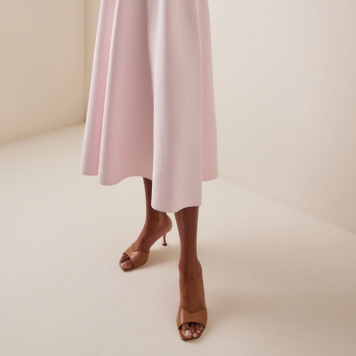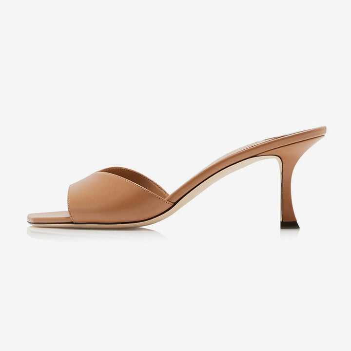 These brown calf leather mules feature a square toe, slip-on design, and a sleek 70 mm tapered heel, offering understated elegance that pairs effortlessly with any look.