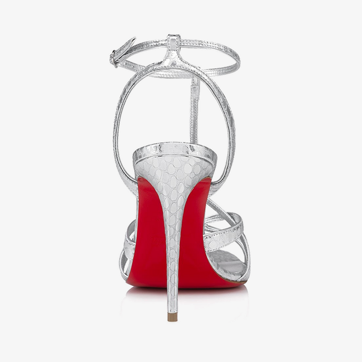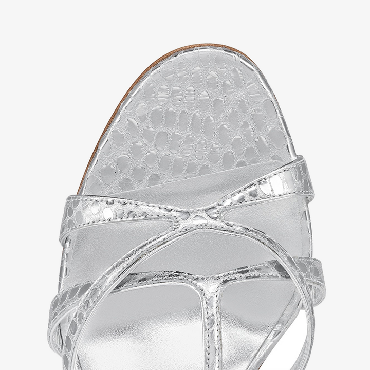 With its plunging vamp, the sandal elegantly reveals the foot. Crafted in silver calf leather with a textured scale effect, this model stands on a 100 mm heel with a small platform for added comfort. The front straps create a striking graphic effect, while a metallic clasp on the side adds a sophisticated finishing touch. Perfect for those seeking both elegance and bold style.