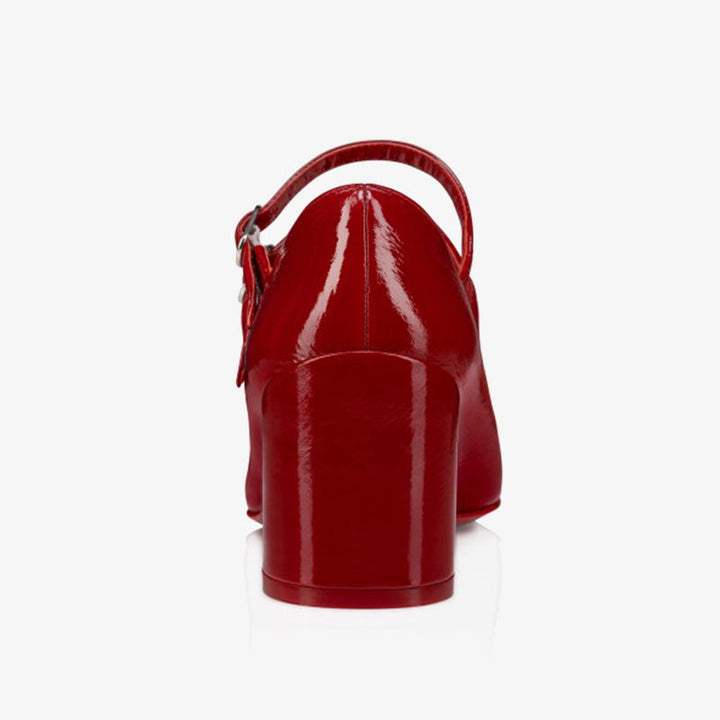 This pump is distinguished by its bevelled, wide 55mm heel. Crafted entirely from red patent leather, it features a rounded toe and an audacious signature vamp. Two slender straps with a metallic clasp delicately adorn the foot. The flexible nature of patent leather ensures suppleness, while the wrinkled effect may show slight variations between the photo and the actual product.