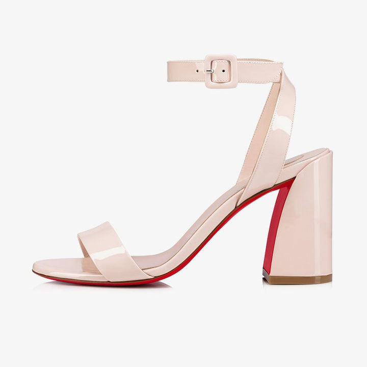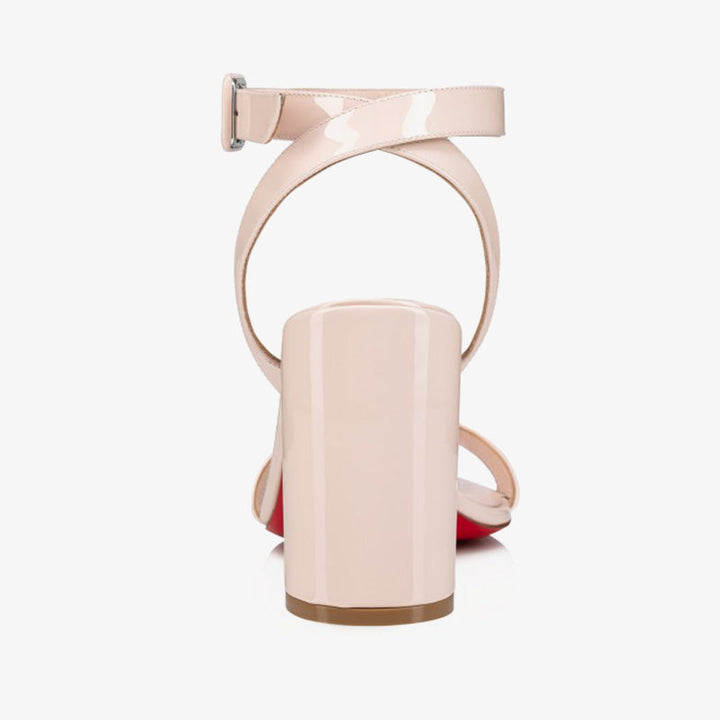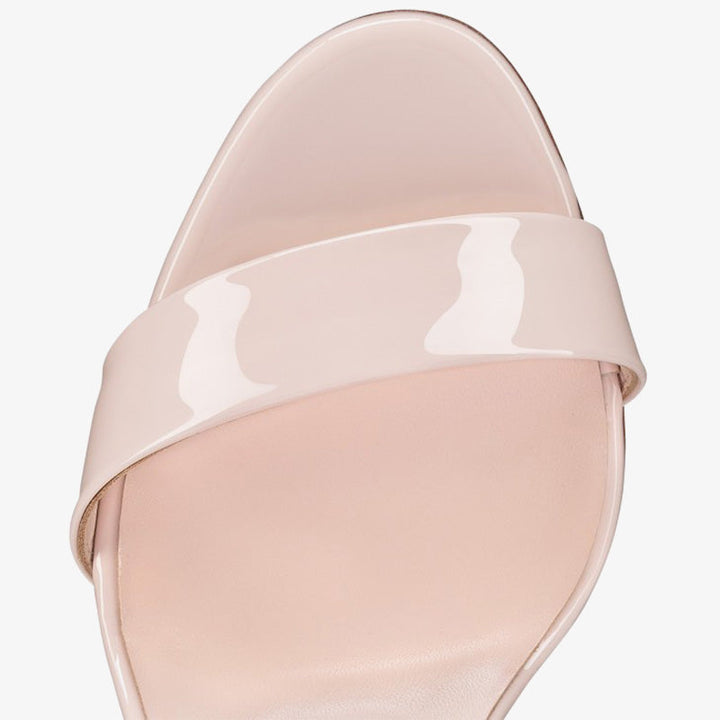 Timeless yet daring, the sandal features sleek lines and a refined silhouette. Crafted in beige patent calf leather, it’s set on an 100 mm heel that offers a graceful lift. The design includes a tonal square clasp and elegant straps that cross behind the ankle, delivering a sophisticated finish. The soft beige color enhances its versatility, perfect for polished day looks or elevated evening style.