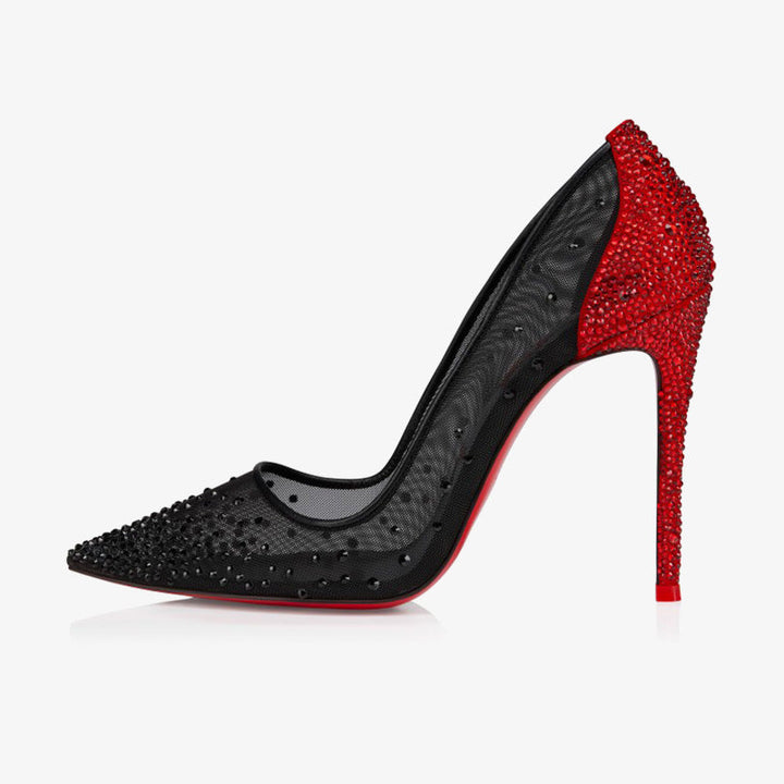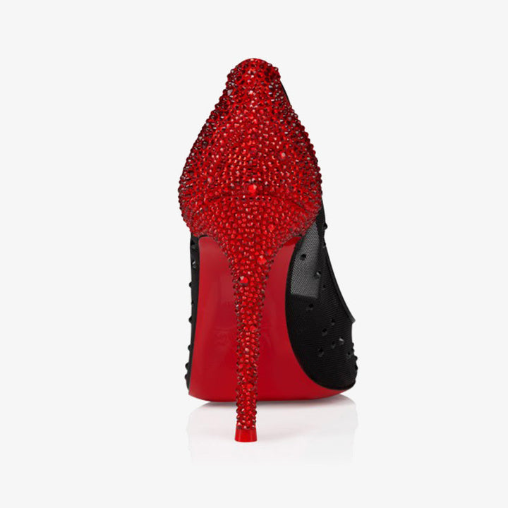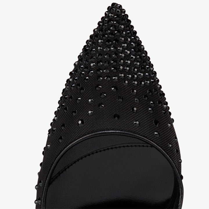 The mesh pump features an irresistibly bold design that embodies refined craftsmanship. Set on a 100 mm heel, this striking style is crafted from sheer black mesh. The vamp and heel are adorned with a series of rhinestones, creating a scintillating effect that catches the light with every step.