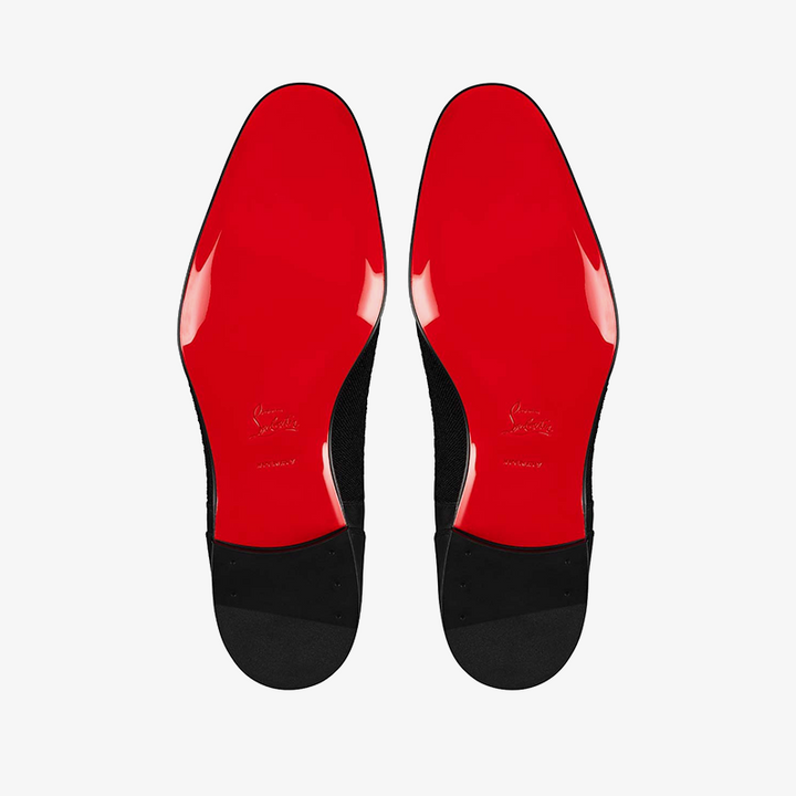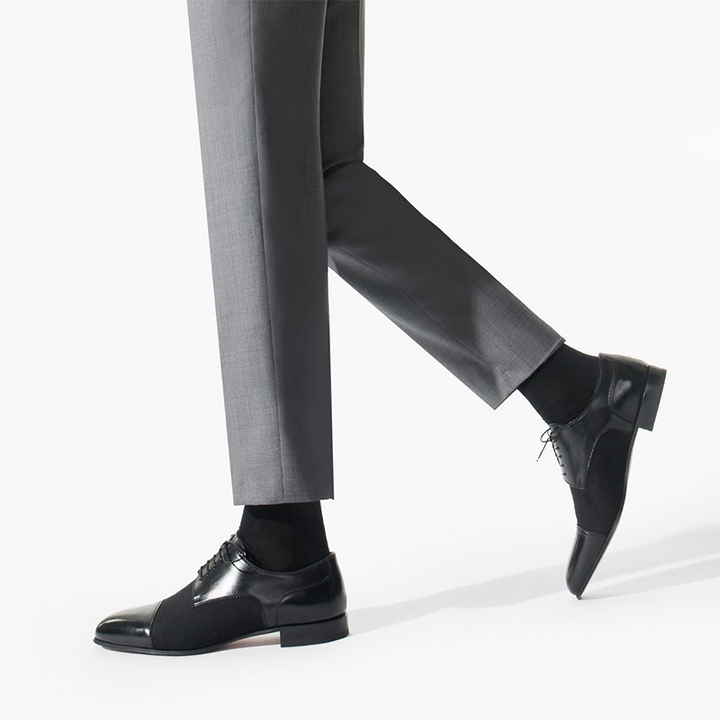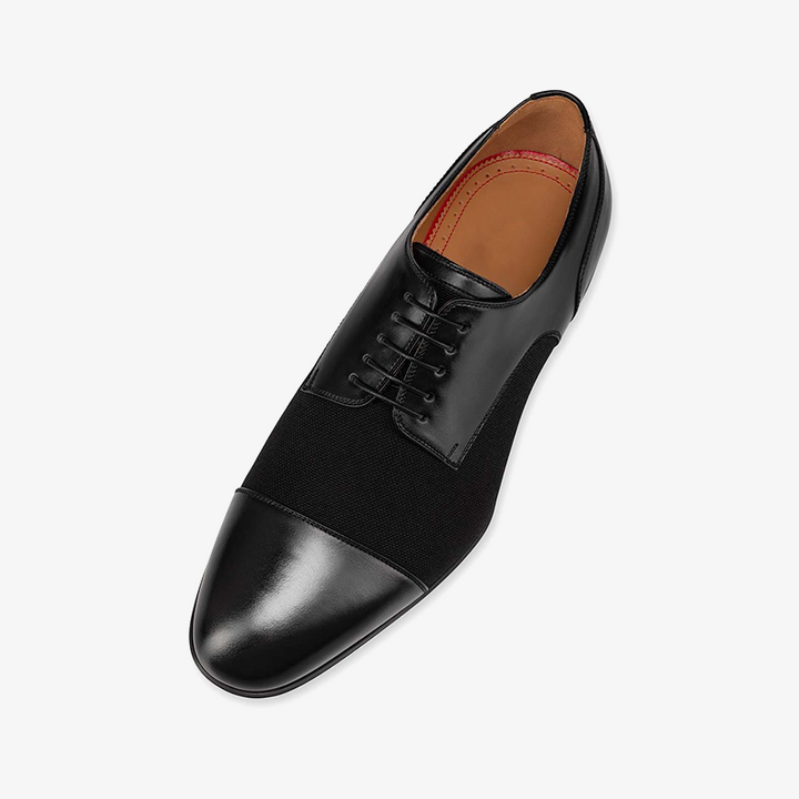 The perfect city shoe for rainy days, this classic derby features a wider fit with a flexible sole for comfort and durability, all while maintaining the iconic red sole. Crafted from black calfskin leather and canvas, it offers a timeless yet modern appeal.