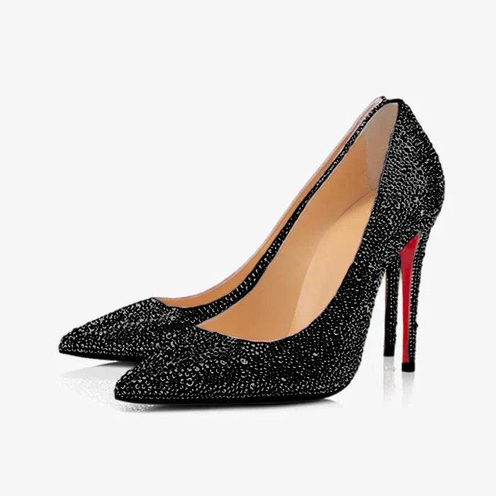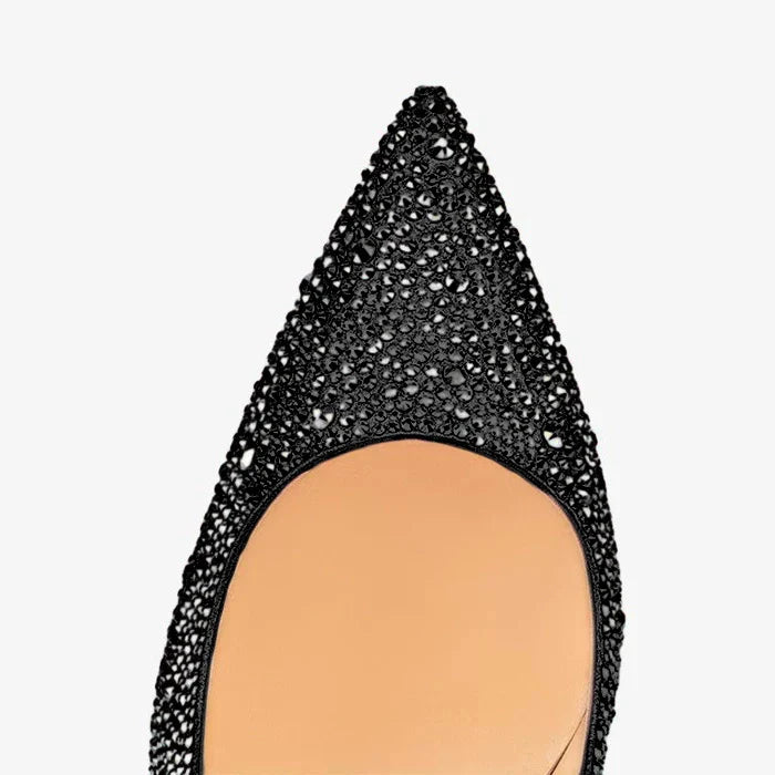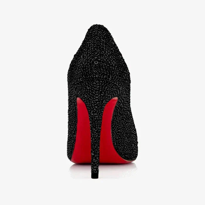 This dazzling stiletto features sleek, elegant lines and is fully adorned with sparkling rhinestones. With its slender 100mm heel and modern pointy toe, it strikes the perfect balance between contemporary flair and timeless elegance. The upper and heel are covered in metallic strass, catching the light in a stunning array of sizes, making this a bold statement piece for any wardrobe.