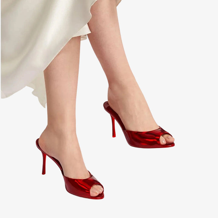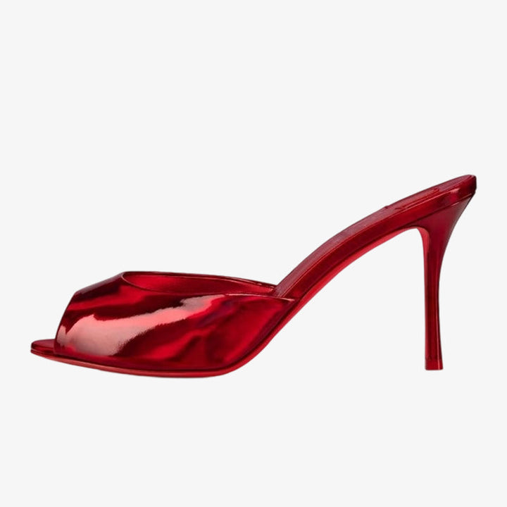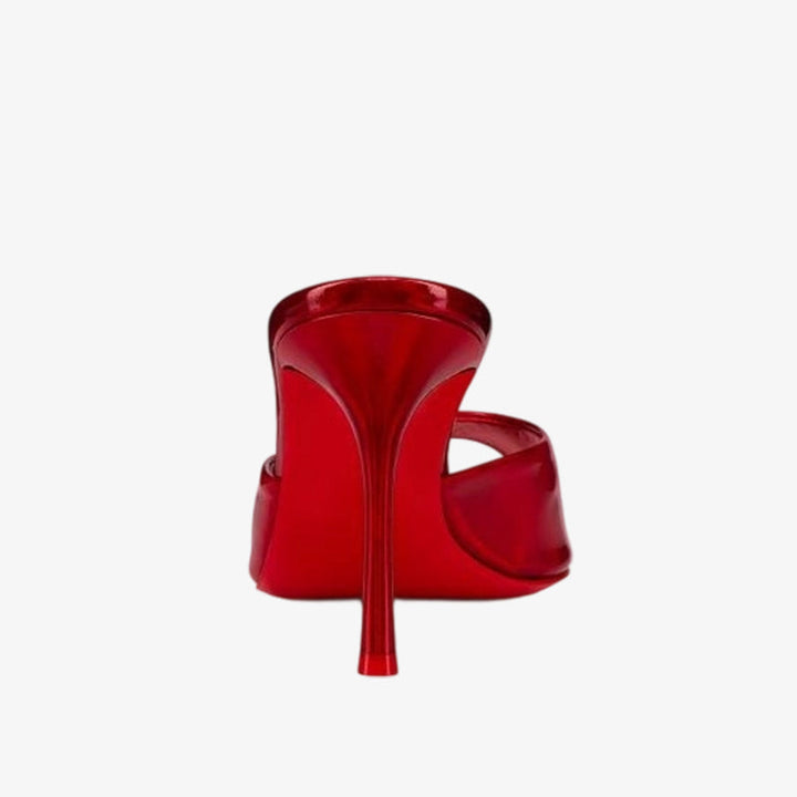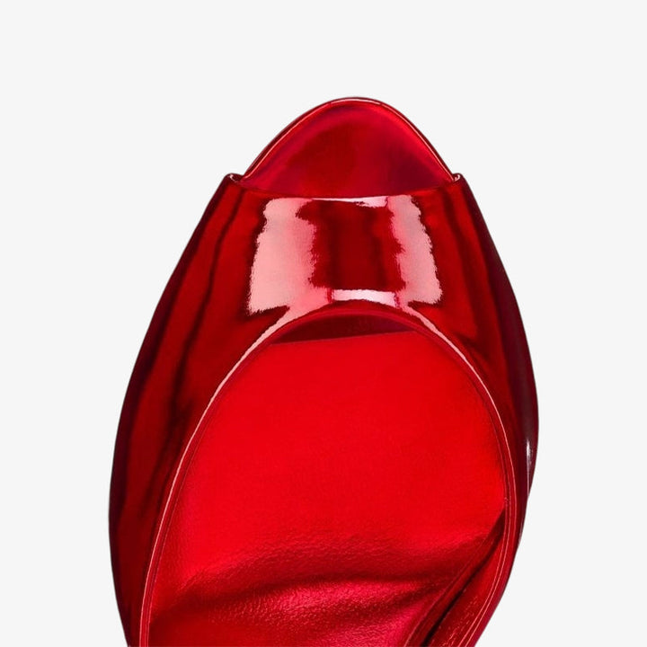 This timeless sandal in glossy red patent leather features an open toe and a daring low-cut vamp. Set on a sleek stiletto heel, it elegantly reveals the foot with refined, minimal details.