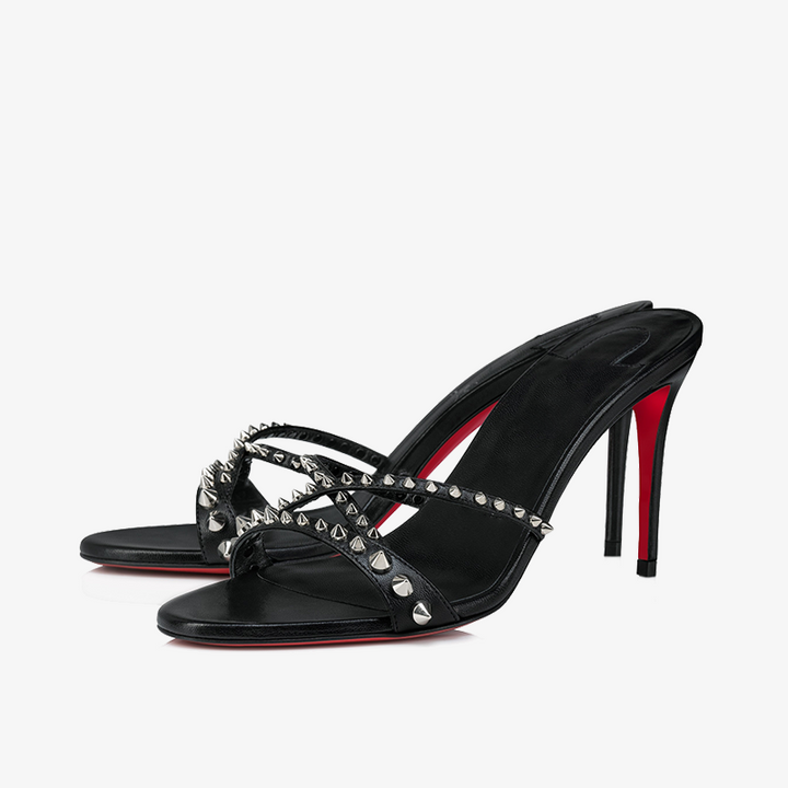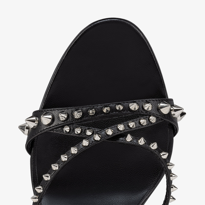 This elegant sandal features slender straps crossing over the foot, each adorned with bold spikes for an edgy touch. Crafted from black calf leather, it sits on a refined 80 mm heel, combining sleek sophistication with a daring design.