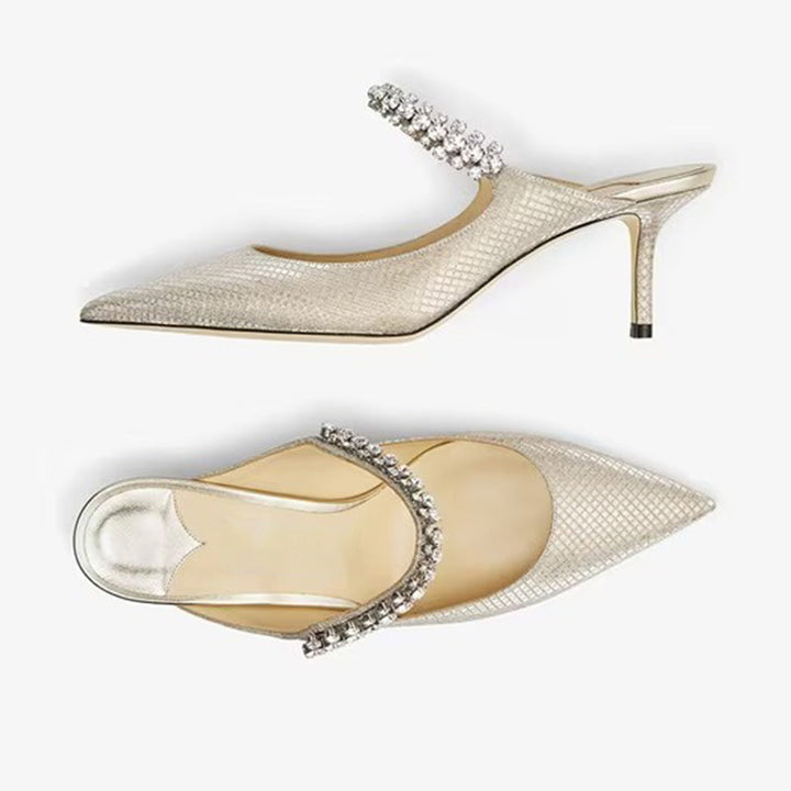These bold mules feature a silver snake-effect finish, accented with sparkling crystal embellishments. Set on a sleek 65mm heel, they deliver a striking blend of glamour and sophistication—perfect for evening occasions or standout looks.