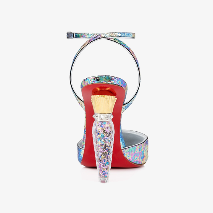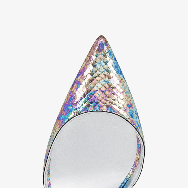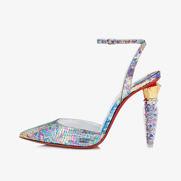 This exquisite pump features a pointed toe and slender ankle strap, with a 100 mm heel crafted from three separate molds and hand-assembled. The heel showcases a glitter effect on its bottom section, beautifully matching the silver-tone python-printed Metal Snake leather upper with an aurora borealis shimmer. A perfect blend of luxury and craftsmanship.