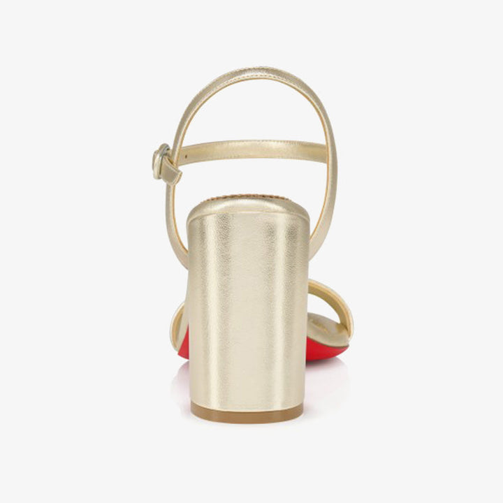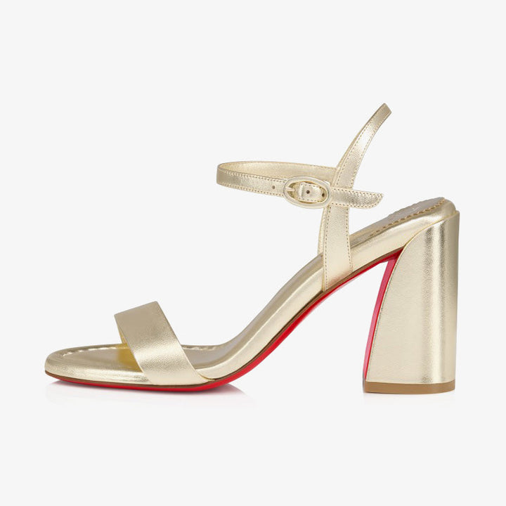 These delicate sandals are crafted from luxurious platinum leather and feature a square, bevelled 100mm heel. The slim strap elegantly wraps around the top of the foot, while a subtle ankle strap with a small metal clasp adds an elegant finishing touch, creating a sophisticated look for any occasion.It sits on a comfortable 80mm heel .
