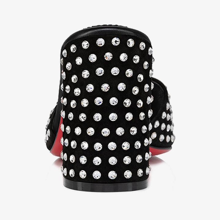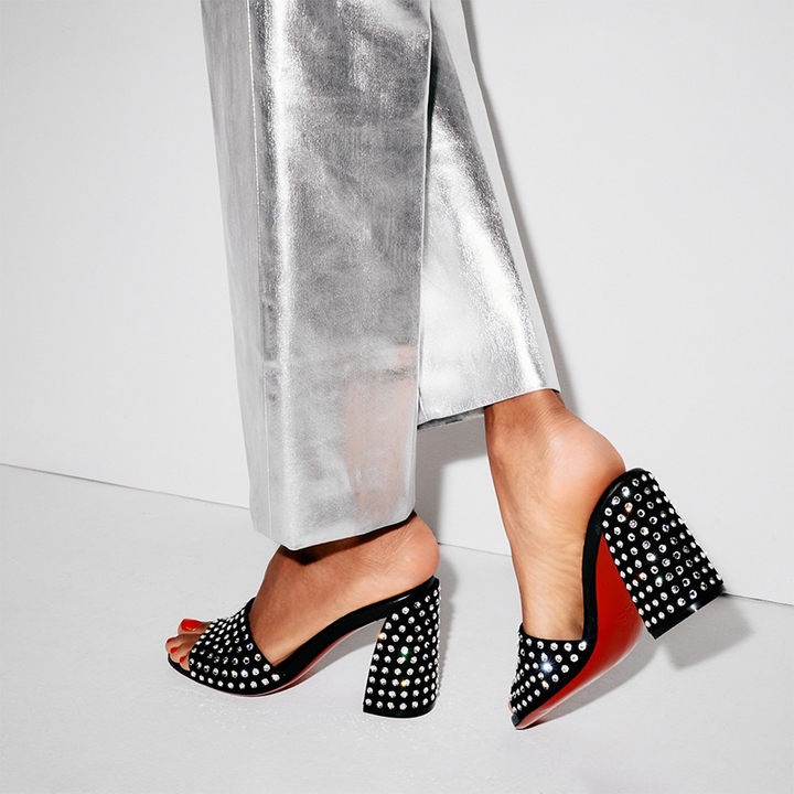 This elegant sandal features a square, angled 100 mm heel, offering both style and comfort. Crafted from luxurious black velvet, it is adorned with hand-placed strass for a subtle touch of sparkle. The clean, slender strap elegantly dresses the foot, with discreet finishing touches that elevate this timeless design.