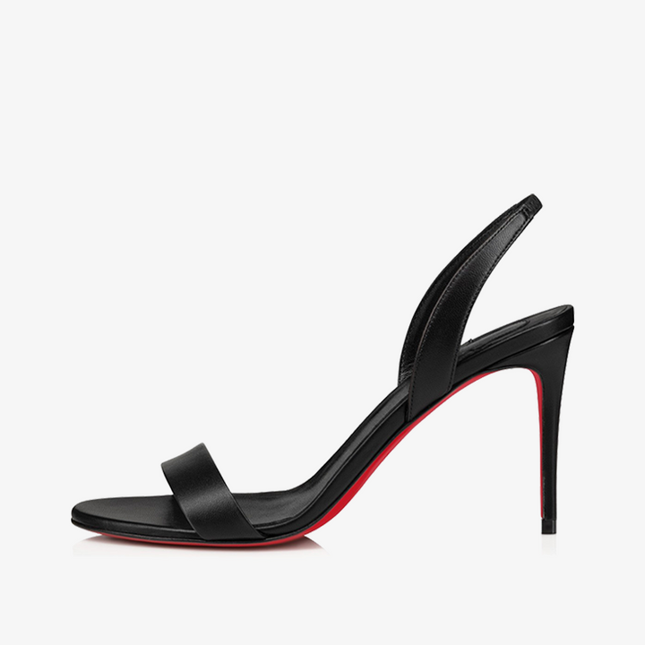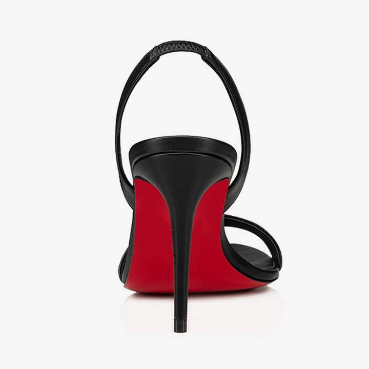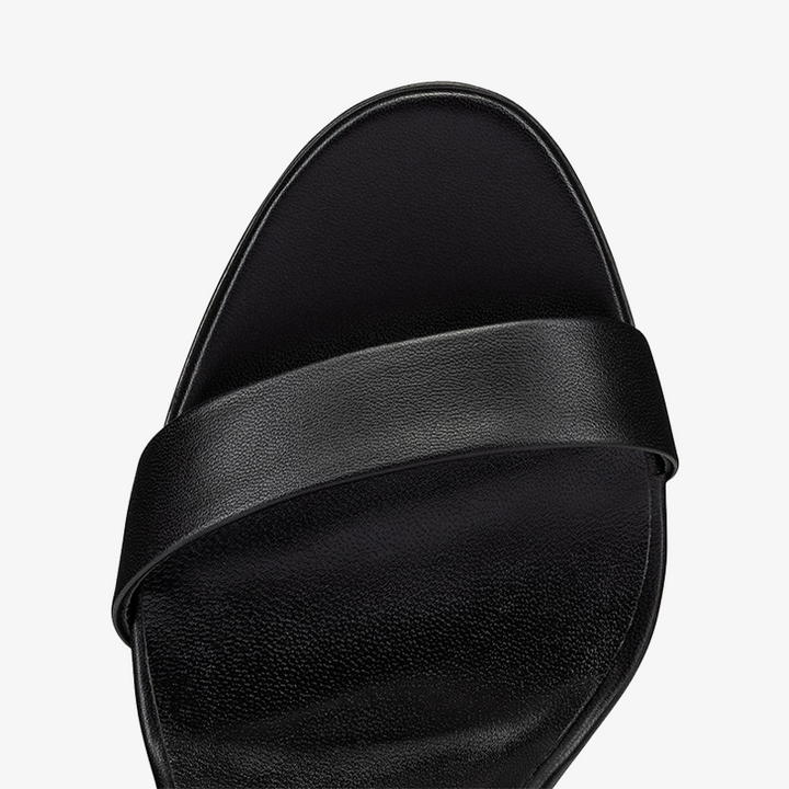 This sandal features graceful lines that elegantly highlight the foot. Crafted from smooth black calf leather, it offers a refined, flattering design perfect for any occasion.Set on a 100 mm heel,