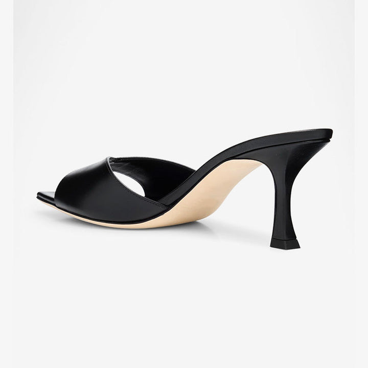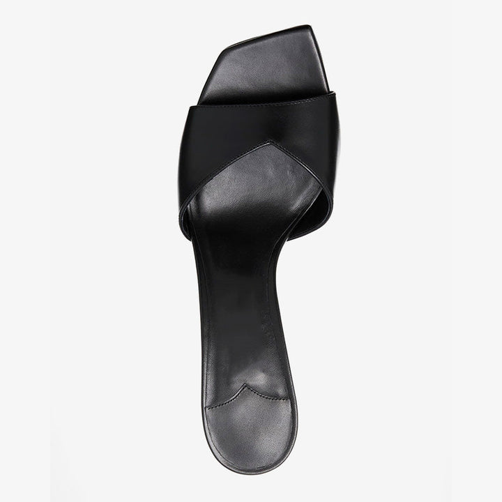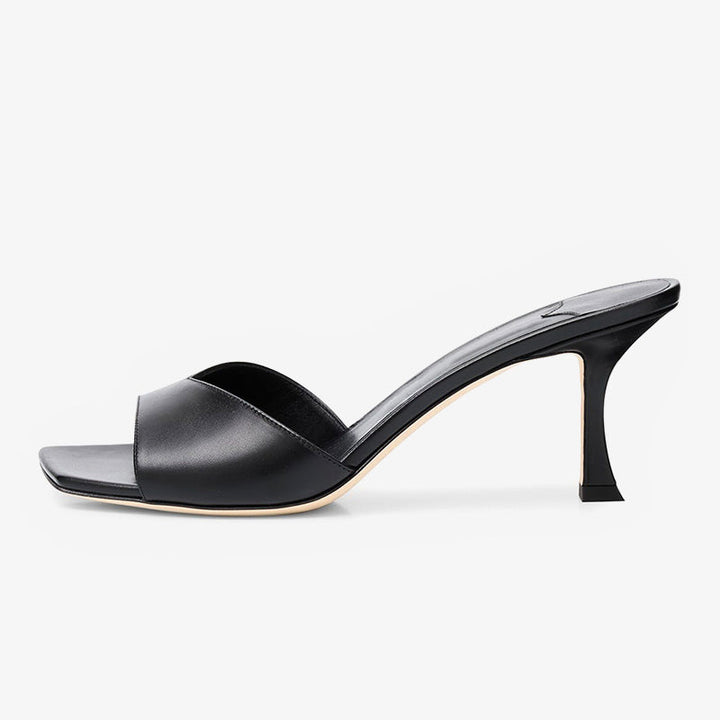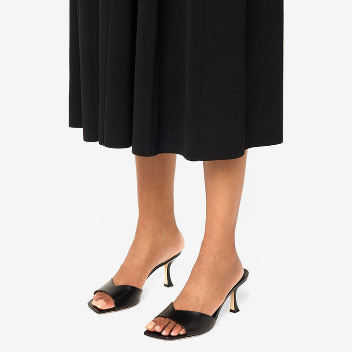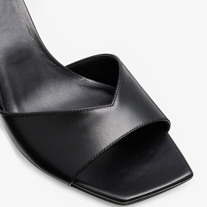 Description:Crafted from smooth calf leather, these slip-on sandals feature a low-cut vamp, square toe, leather lining, and a sculpted 70 mm curved heel for a sleek, modern silhouette.