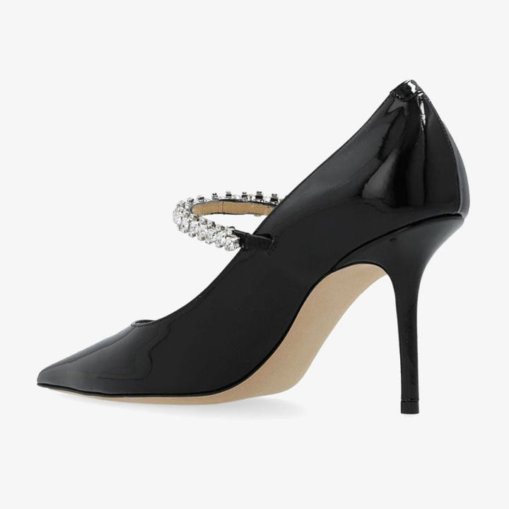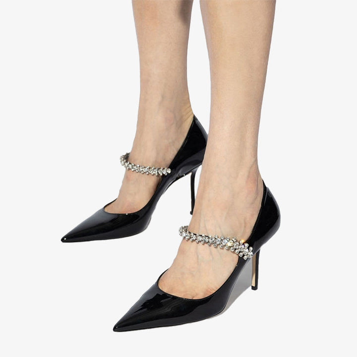 These black patent leather pumps feature a sharp pointed toe and are adorned with sophisticated bead accents. The slip-on design ensures effortless elegance, while the stiletto heel provides a striking finish. With a leather outsole, these pumps offer the perfect balance of style and comfort for any event.The heel height of this pair is 80mm.