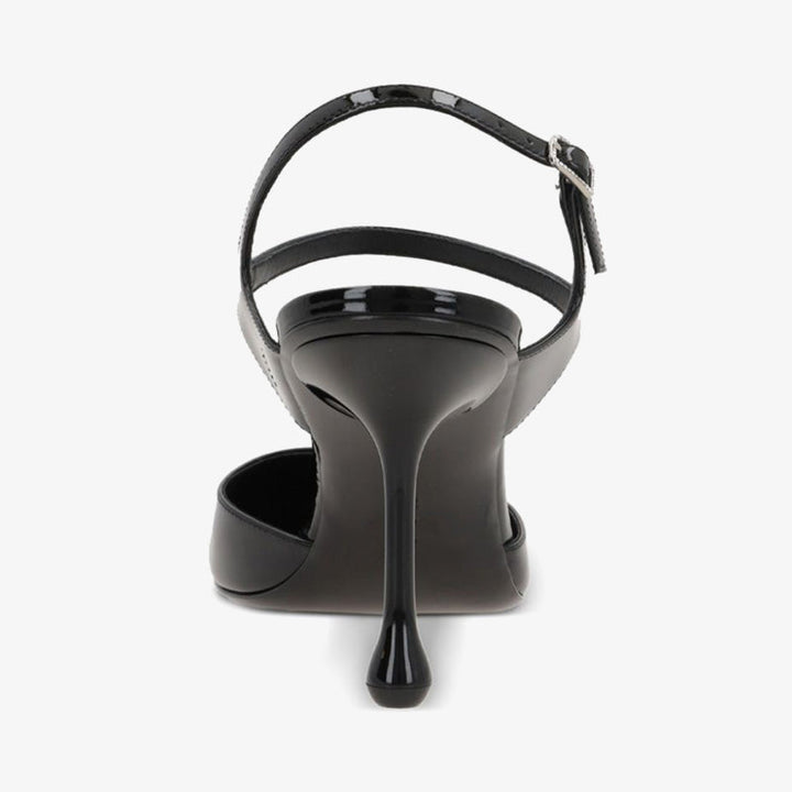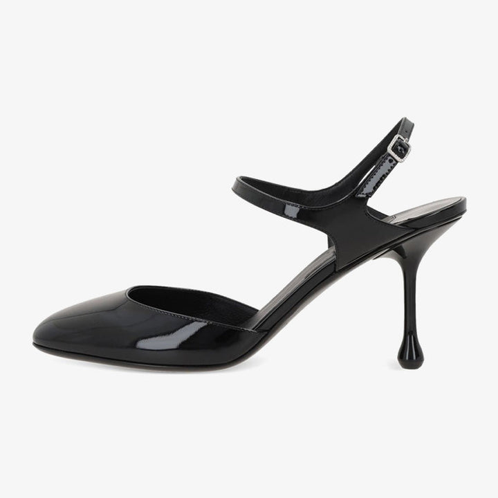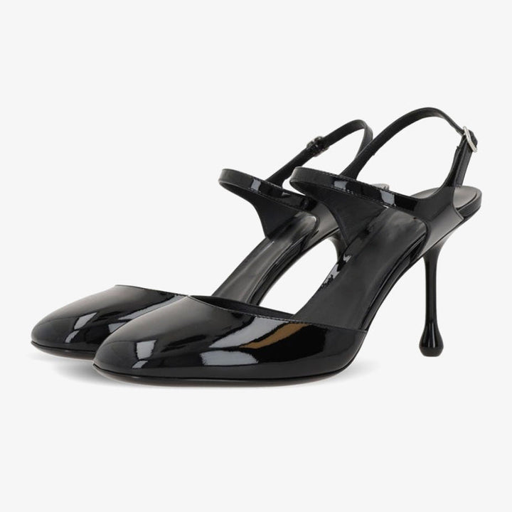 Crafted from patent leather, these elegant pumps feature a refined round toe and a delicate ankle strap with a buckle fastening. Set on a slender stiletto heel, they exude timeless sophistication, making them a versatile choice for any occasion.The heel height of this pair is 80mm.