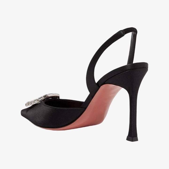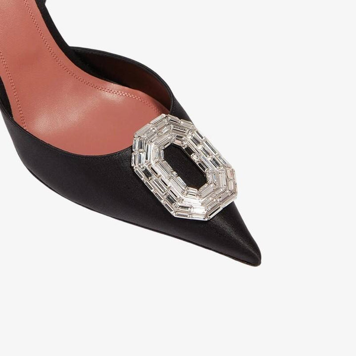 Make a bold statement in these elegant black satin slingbacks, featuring a dazzling crystal buckle and sleek pointed toe. The 85mm heel adds sophisticated height, while the slingback strap ensures a secure, comfortable fit. Crafted with premium leather for lasting quality.Color: black