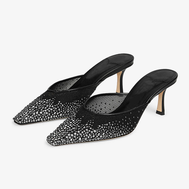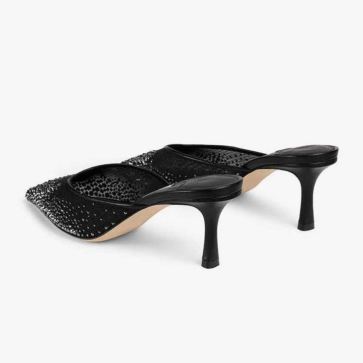 A bold fusion of modern design and refined elegance, these mules feature a sheer mesh upper adorned with a gradient of shimmering crystals. The sleek pointed toe and structured square-cut vamp create a striking silhouette, while the supple leather lining ensures comfort with every step. Perfect for adding a touch of glamour to any ensemble.The heel height of this pair is 60mm.