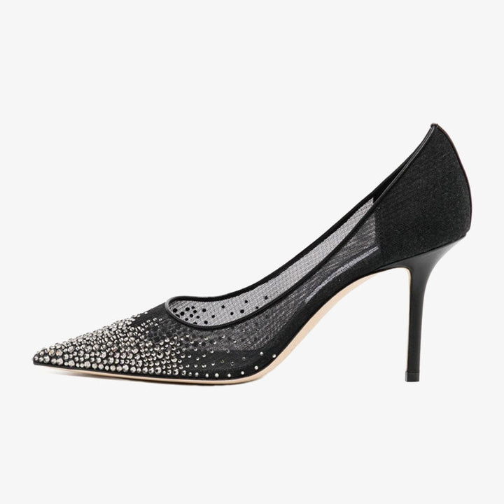 Delicately crafted with sheer mesh and adorned with sparkling crystals, these pumps exude refined glamour. The pointed-toe silhouette and sleek leather construction create an effortlessly elegant look, perfect for elevating any ensemble with sophistication.The heel height of this pair is 80mm.