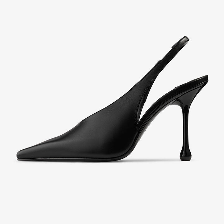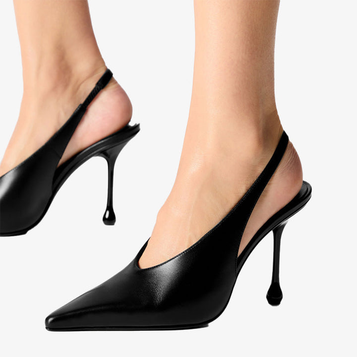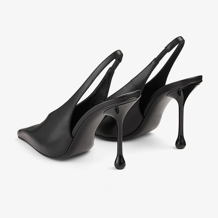 These elegant pumps feature a deep V upper and a sculptural drop heel, elevating the classic slingback silhouette. Crafted from soft calf leather with a timeless pointed toe, they combine sophistication and comfort, making them a versatile addition to any wardrobe.The heel height of this pair is 80mm.