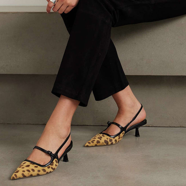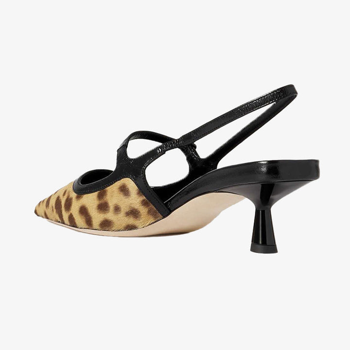These leopard-print calf hair slingback pumps are designed for effortless style, combining pointed toes with sleek leather trim. The elasticated slingback and buckle-fastening strap ensure a comfortable fit, while the angular heels add a contemporary flair. Perfect for both tailored looks and casual denim, they offer versatile elegance for any occasion.The heel height of this pair is 30mm.