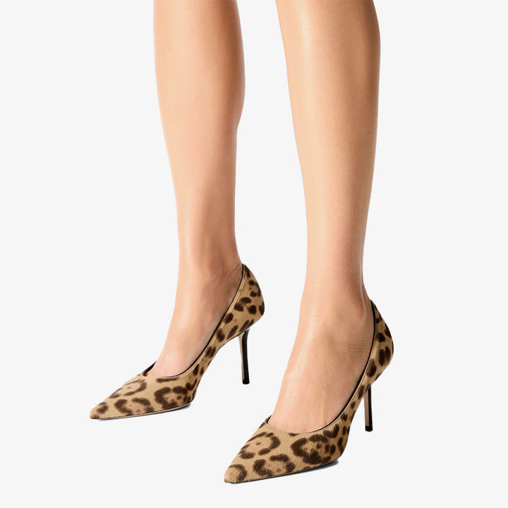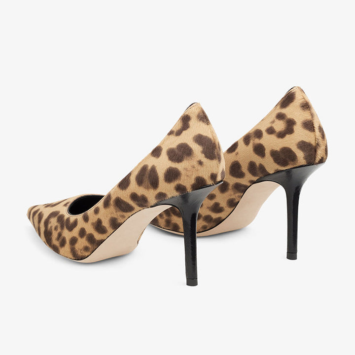 This stiletto pump reimagines the classic design with a bold leopard print pony upper. Its sleek silhouette, defined by clean lines and a pointed toe, creates a refined yet modern look. The hand-sculpted sole provides a comfortable fit, making this the perfect statement piece for any special occasion.The heel height of this pair is 60mm.