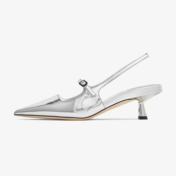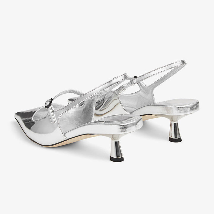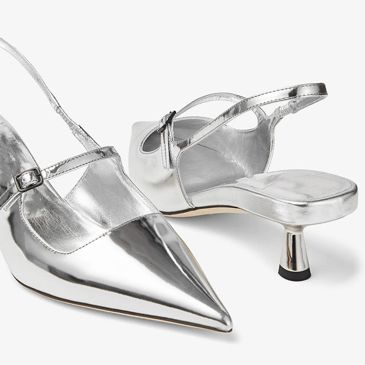 Designed in liquid metal leather, this slingback features a sharp pointed toe and a sophisticated strap fastening. The modern kick heel adds a touch of contemporary elegance, perfect for complementing evening looks. With its eye-catching metallic shine, this style brings effortless glamour and refined allure to any wardrobe.The heel height of this pair is 30mm.