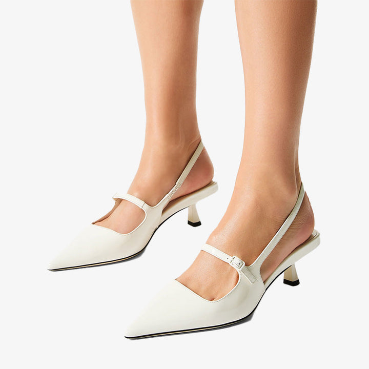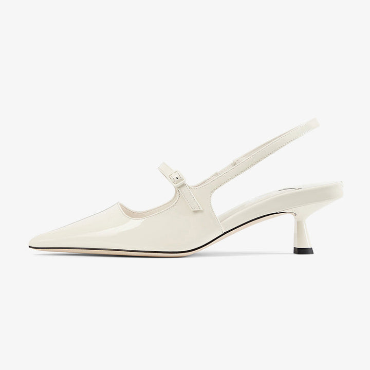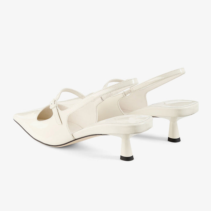These creme patent leather slingback pumps combine modern design with a pointed toe and a distinctive graphic heel. The elasticated strap fastening ensures a comfortable fit, while the leather sole and lining provide lasting elegance and style. Perfect for adding a contemporary touch to any wardrobe.The heel height of this pair is 30mm.