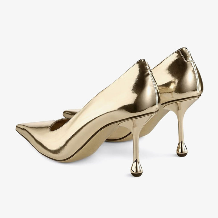 Crafted from glossy patent leather with a luminous metallic sheen, these gold-tone pumps exude sophistication. The sleek pointed toe and effortless slip-on design create a refined silhouette, while the stiletto heel adds a touch of timeless glamour.The heel height of this pair is 80mm.