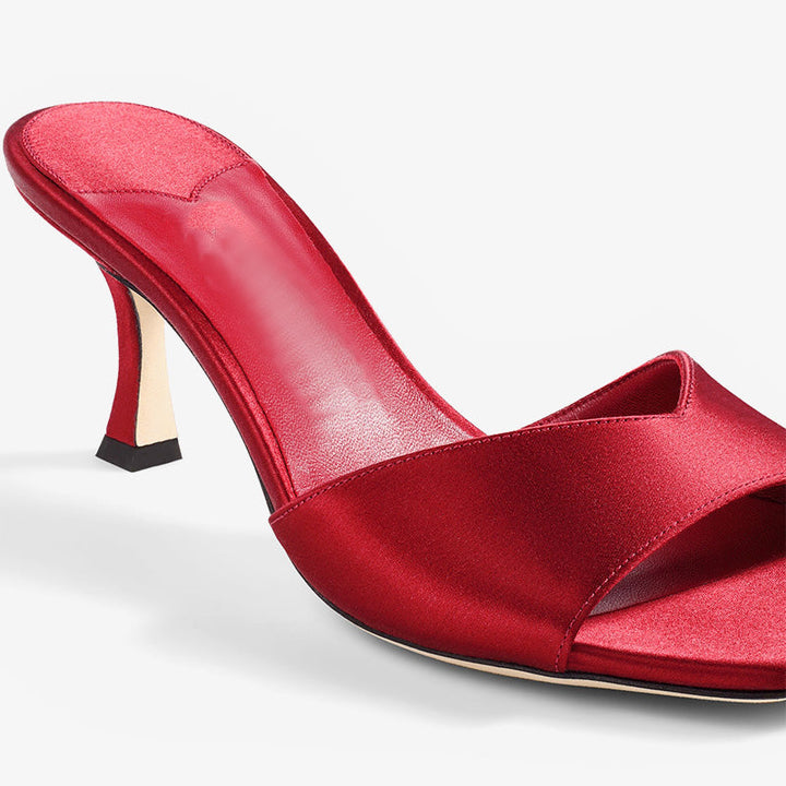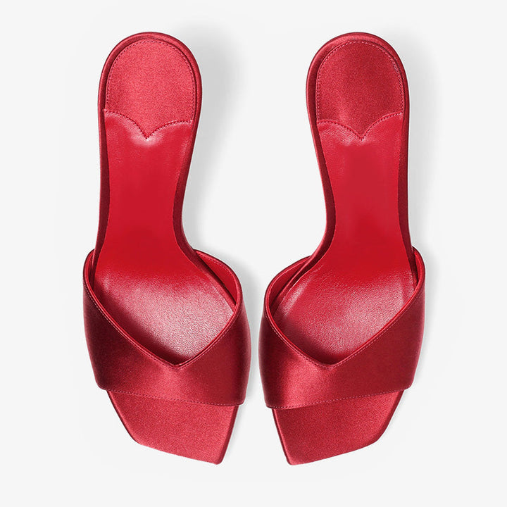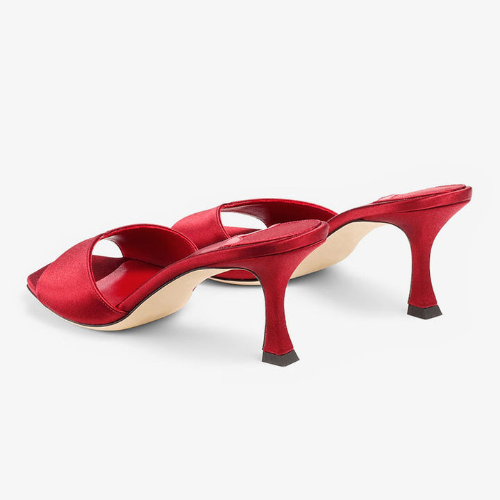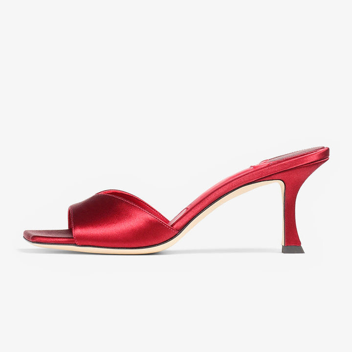 Made from glossy red satin, these sandals showcase a low-cut vamp, square toe, and sculpted 70 mm curved heel for a sleek, elegant silhouette.