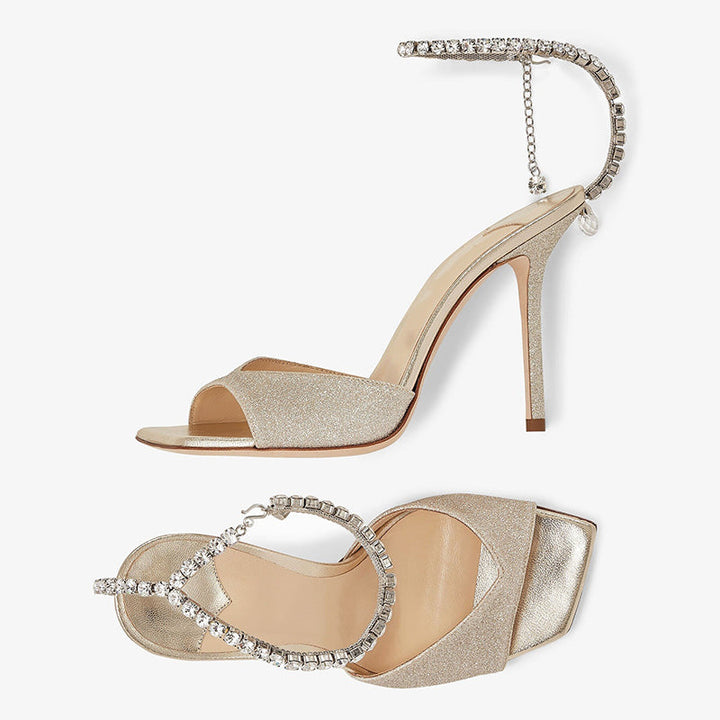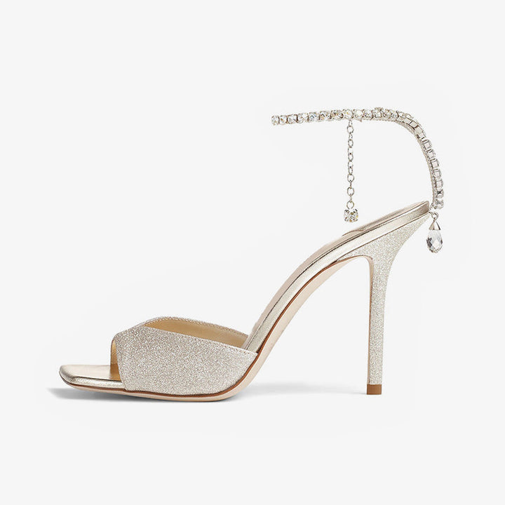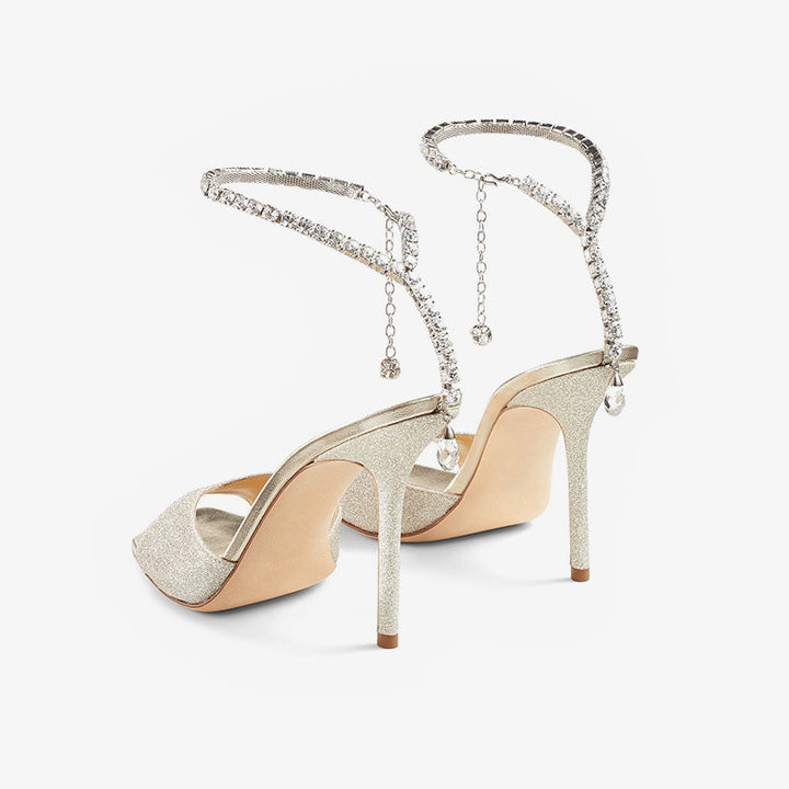 Crafted from shimmering glitter fabric, these silver sandals feature a delicate crystal chain that drapes elegantly around the ankle, accented by a single drop crystal. Set on a slim 100mm heel, the pointed design brings a striking, jewel-like finish to evening looks. Color:silver