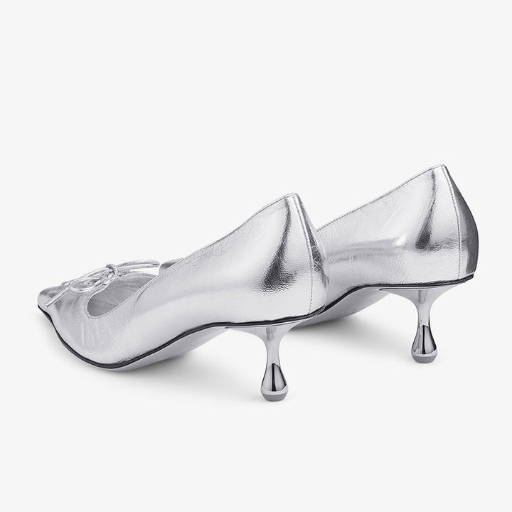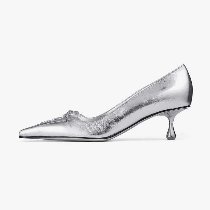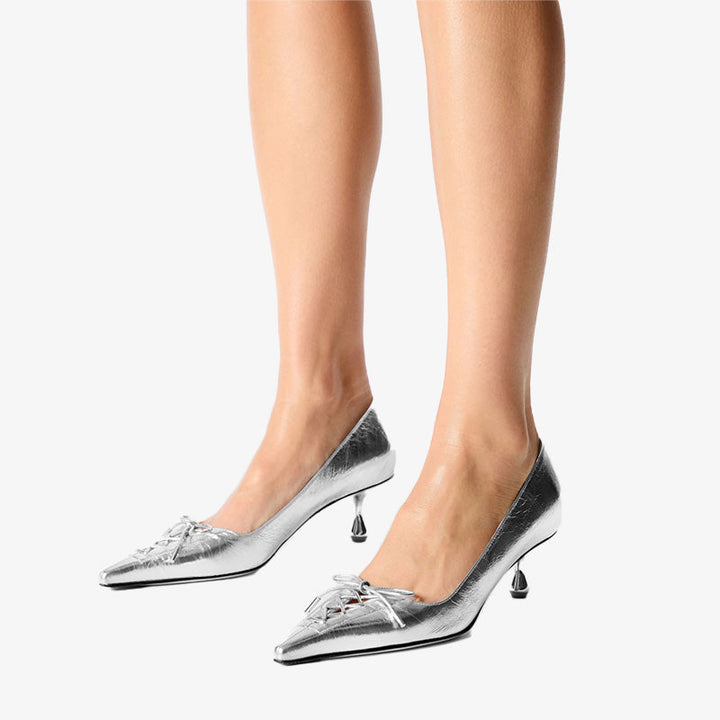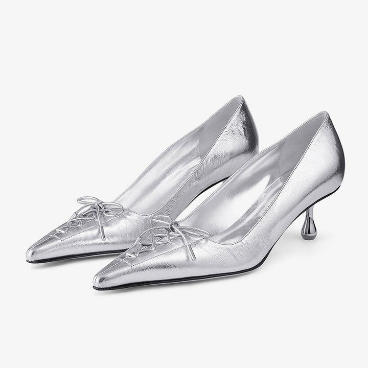A timeless silhouette reimagined with artisanal craftsmanship, these pumps feature a hand-threaded leather lace corset detail on the upper, seamlessly secured with invisible stitching. Made from vintage metallic leather, the design is finished with a sleek pointed toe, a sculpted drop heel, and a supple leather lining for effortless sophistication.The heel height of this pair is 60mm.