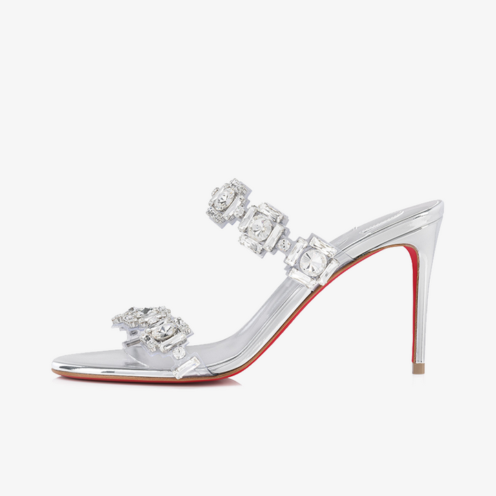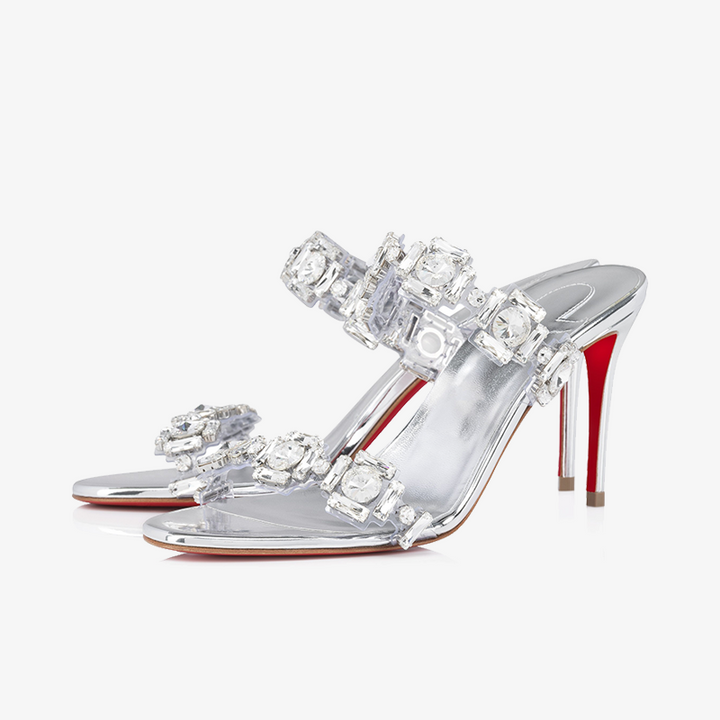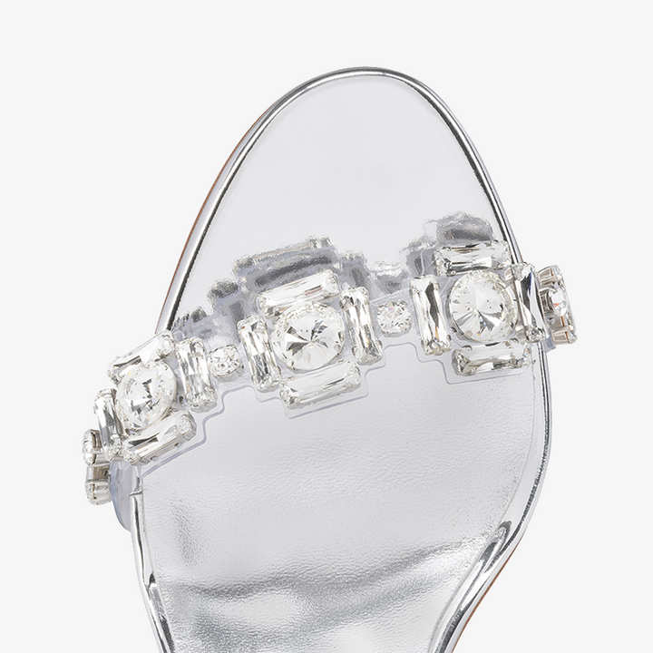 The refined sandal showcases a sophisticated design with two transparent PVC straps adorned with hand-applied square silver jewels. The bare foot rests on a slim 80 mm heel, while the entire model is crafted from silver-colored calf leather, offering a shimmering, modern finish.Color:silver