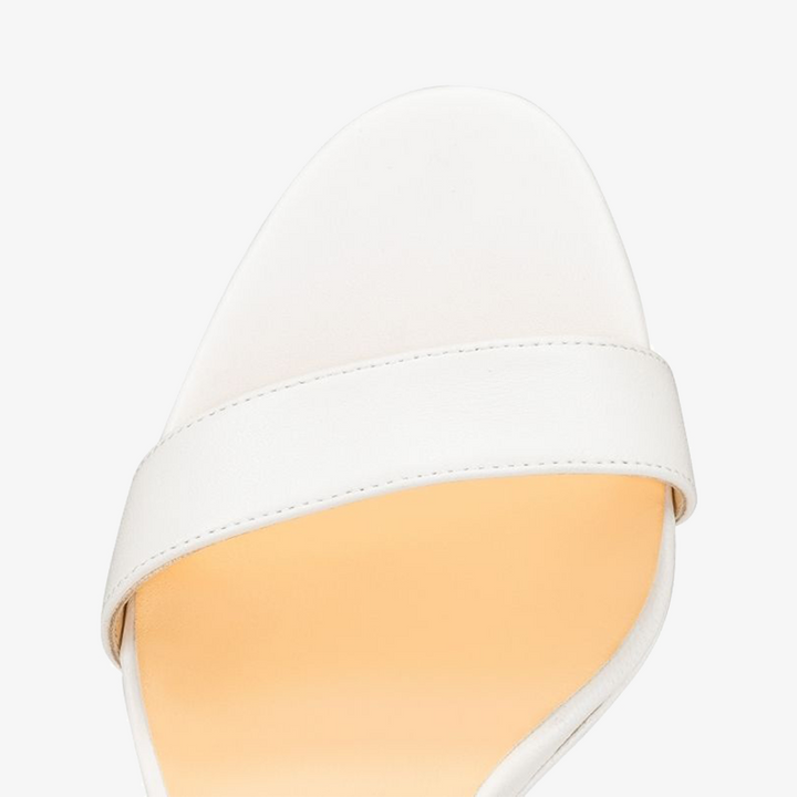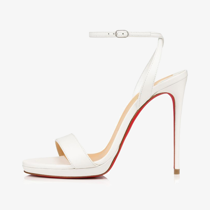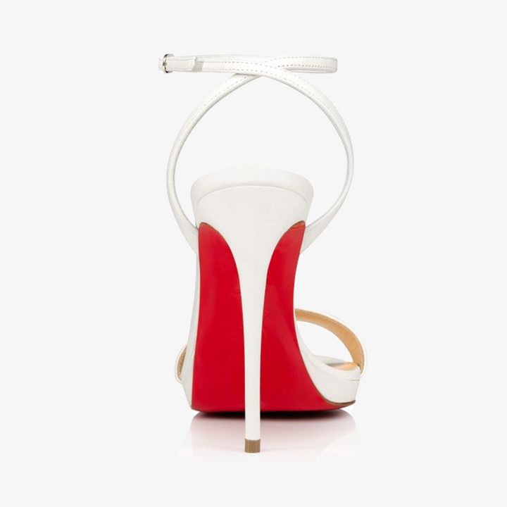 Unleash your inner vamp with this timeless stiletto sandal, reworked in white calf leather for a versatile and elegant look. Perfect for pairing with dresses or even a wedding gown, it features a delicate ankle strap resting on a 120 mm wrapped stiletto heel. The asymmetrical front strap sits atop a wearable platform sole, offering a touch of simple sophistication.