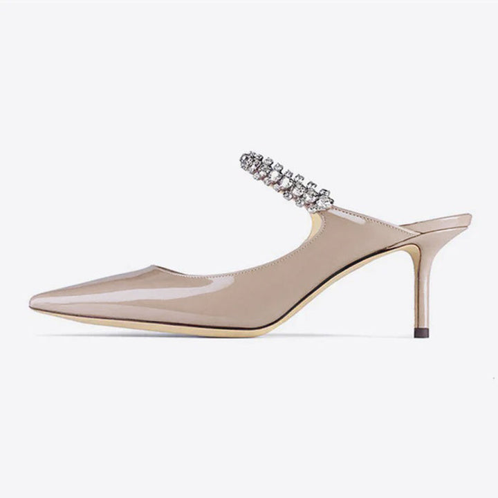 Sleek and feminine, these glossy patent leather mules feature a pointed toe and a crystal strap for a touch of glamour. Designed with a slip-on silhouette, leather lining and sole, and a 65mm heel that elongates the legs.