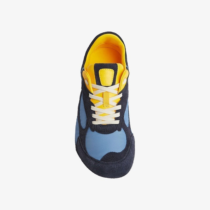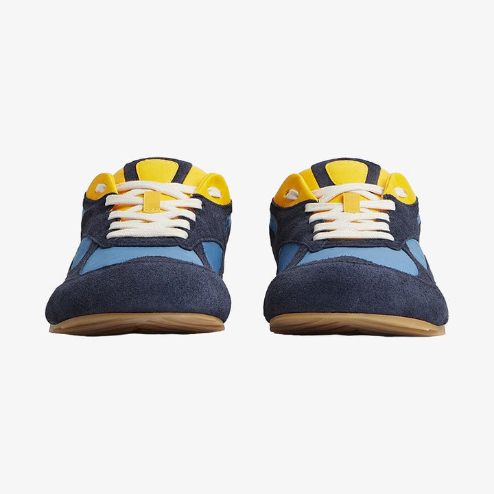Sleek low-top lace-up sneaker crafted from soft suede and lightweight nylon, featuring leather trims for subtle detail. Lined with calf leather for comfort, this pair comes in an Abyss/Ice/Egg Yolk color palette and sits on a durable rubber outsole.