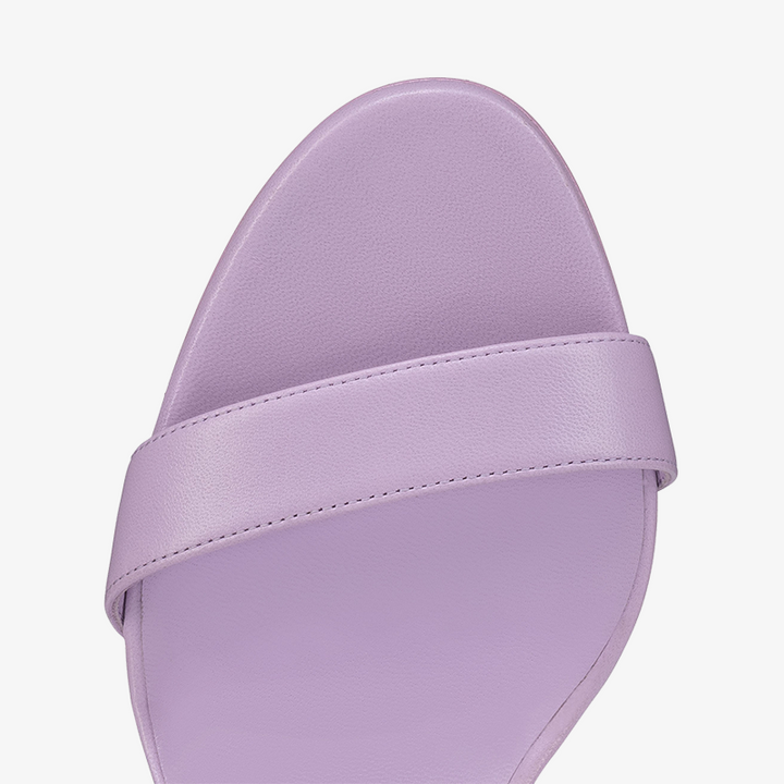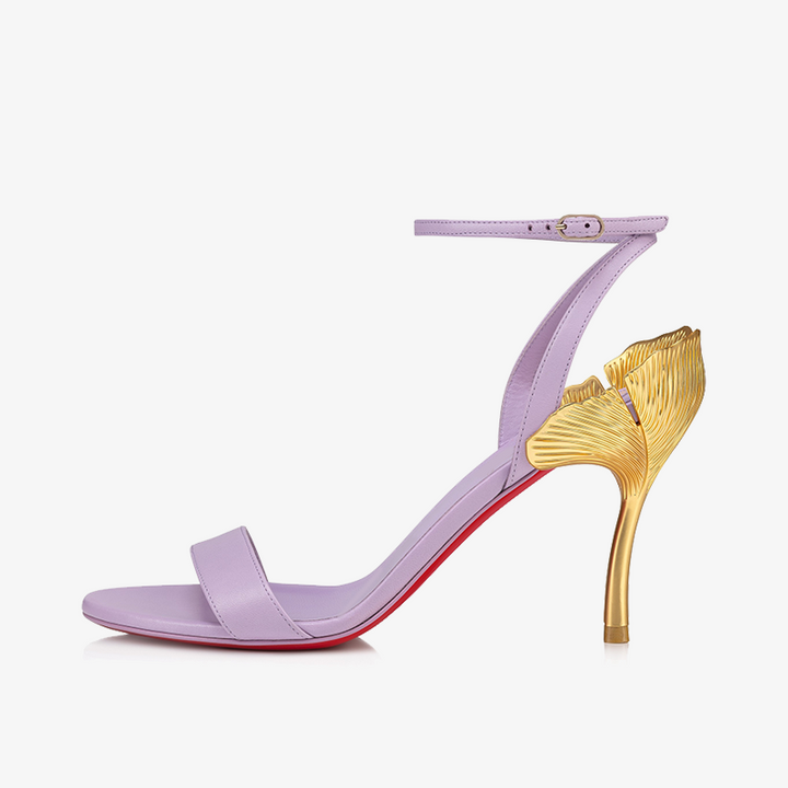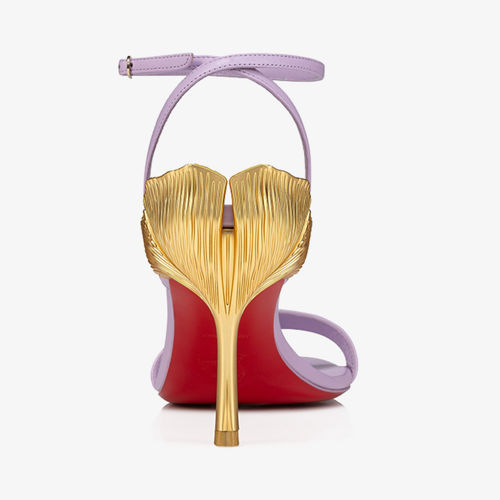 An elegant sandal showcasing slender straps that delicately dress the foot. Crafted from premium calf leather, it features a golden 80 mm heel designed to resemble a Ginkgo leaf, a renowned Asian plant. The sleek pump fastens around the ankle with a strap and metal clasp, adding a refined touch to any look.