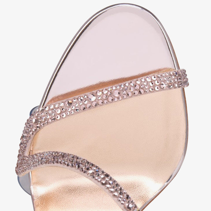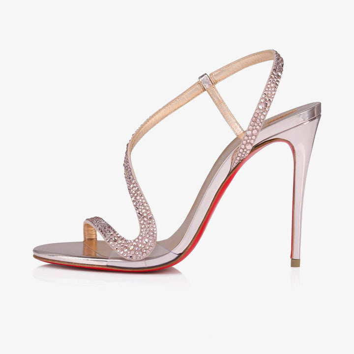 The refined sandal stands out with a thin metallic suede strap that gracefully wraps around the foot. Adorned with tone-on-tone strass in a soft Vintage Rose hue, it exudes feminine elegance. Set on a slender stiletto heel, the design is delicately finished with subtle details and a padded insole for extra comfort. The romantic Vintage Rose color adds charm, while the high heel brings a touch of drama and poise.The heel measures approximately 100 mm