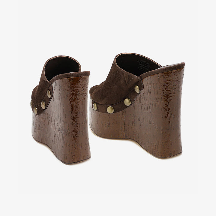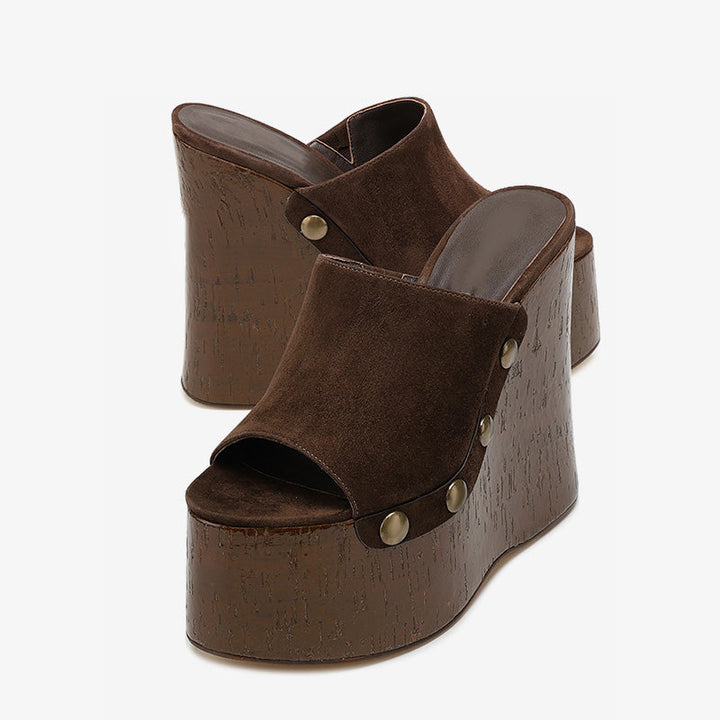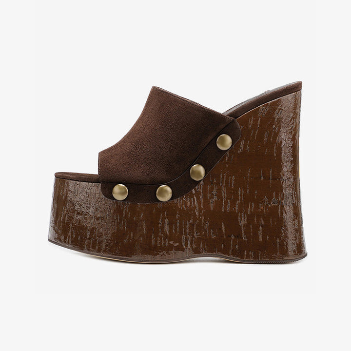 Crafted from luxurious suede, these statement wedge heels feature a 140 mm shiny cork-wrapped platform, peep toe silhouette, and bold decorative studs. Finished with a leather lining and embossed leather insole for all-day comfort and style.