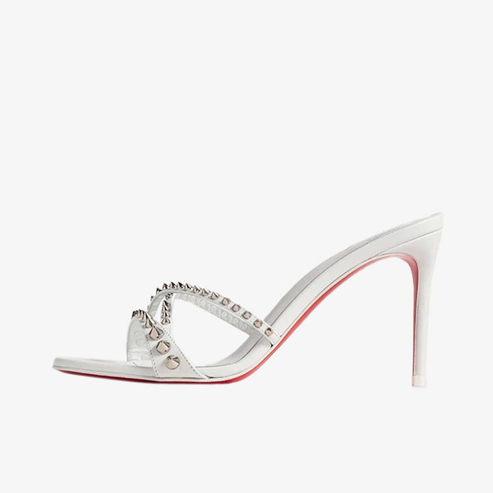 The sandal features signature silver-tone studs for a rebellious touch. Made from supple white calf leather, it is designed in a strappy silhouette and sits on slim 80 mm heels. A slip-on design adds to its ease of wear.